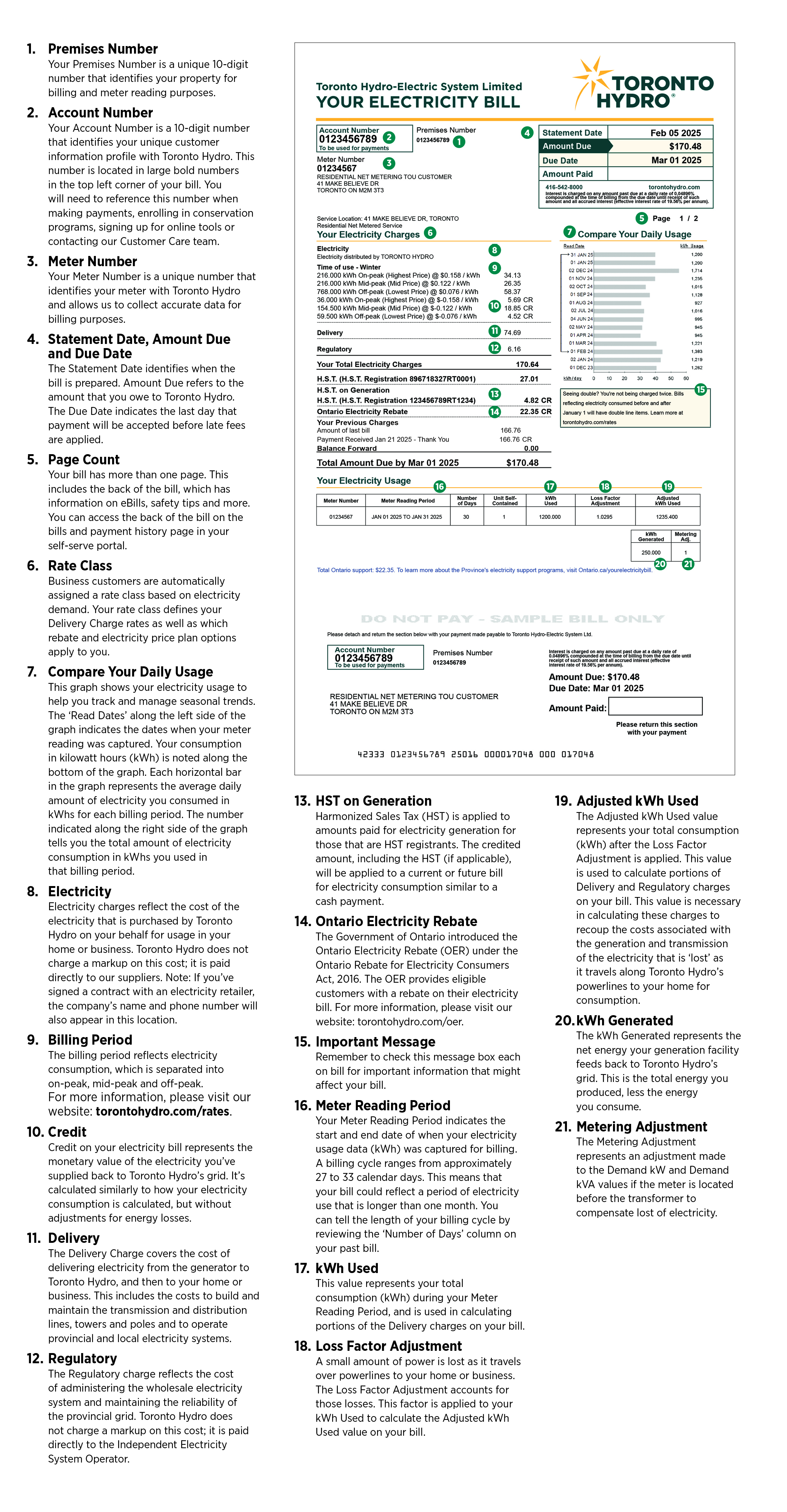 - The Statement Date identifies when the bill is prepared. Amount Due refers to the amount that you owe to Toronto Hydro. The Due Date indicates the last day that payment will be accepted before late fees are applied.